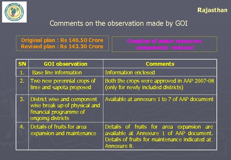 Rajasthan Comments on the observation made by GOI Original plan : Rs 146. 50 Crore Revised plan : Rs 143. 30 Crore SN 1. GOI observation Base line information Creation of water resources components reduced Comments Information enclosed 2. Two new perennial crops of lime and sapota proposed Both the crops were approved in AAP 2007 -08 (only for newly included districts) 3. District wise and component Available at annexure 1 to 7 of AAP document wise break up of physical and financial programme of ongoing districts 4. Details of fruits for area expansion and maintenance Details of fruits for area expansion are available at Annexure 1 of AAP document. Details of fruits for maintenance indicated at Annexure 8.