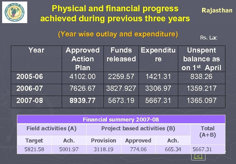 Physical and financial progress achieved during previous three years (Year wise outlay and expenditure) Year 2005 -06 Rajasthan Rs. Lac Approved Funds Expenditu Unspent Action released re balance as Plan on 1 st April 4102. 00 2259. 57 1421. 31 838. 26 2006 -07 7626. 67 3827. 927 3306. 97 1359. 217 2007 -08 8939. 77 5673. 19 5667. 31 1365. 097 Financial summery 2007 -08 Field activities (A) Project based activities (B) Target Ach. Provision Approved Ach. 5821. 58 5001. 97 3118. 19 774. 06 665. 34 Total (A+B) 5667. 31 {<} 7