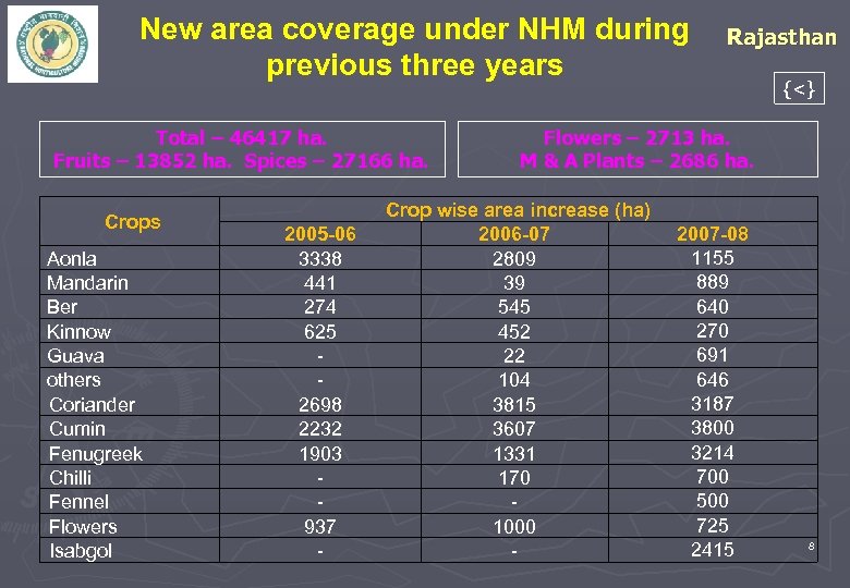 New area coverage under NHM during previous three years Total – 46417 ha. Fruits – 13852 ha. Spices – 27166 ha. Crops Aonla Mandarin Ber Kinnow Guava others Coriander Cumin Fenugreek Chilli Fennel Flowers Isabgol 2005 -06 3338 441 274 625 2698 2232 1903 937 - Rajasthan {<} Flowers – 2713 ha. M & A Plants – 2686 ha. Crop wise area increase (ha) 2006 -07 2809 39 545 452 22 104 3815 3607 1331 170 1000 - 2007 -08 1155 889 640 270 691 646 3187 3800 3214 700 500 725 2415 8