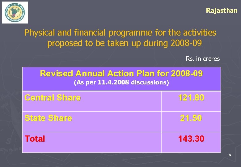 Rajasthan Physical and financial programme for the activities proposed to be taken up during 2008 -09 Rs. in crores Revised Annual Action Plan for 2008 -09 (As per 11. 4. 2008 discussions) Central Share 121. 80 State Share 21. 50 Total 143. 30 9