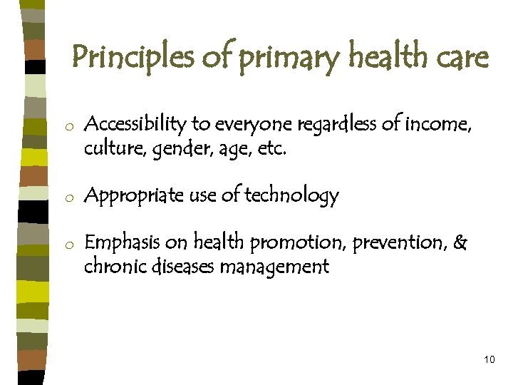 Principles of primary health care o Accessibility to everyone regardless of income, culture, gender, age, etc. o Appropriate use of technology o Emphasis on health promotion, prevention, & chronic diseases management 10