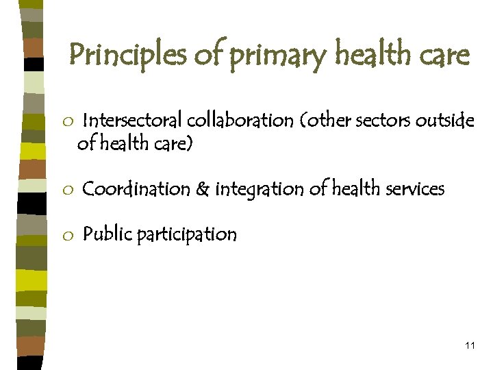 Principles of primary health care o Intersectoral collaboration (other sectors outside of health care) o Coordination & integration of health services o Public participation 11