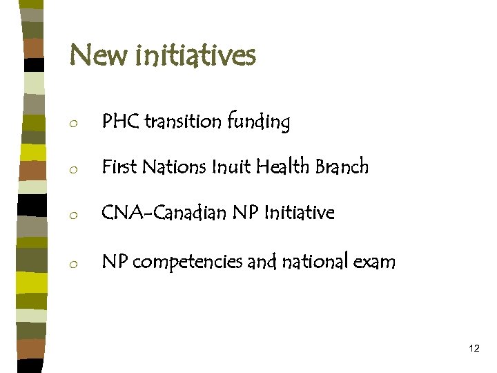 New initiatives o PHC transition funding o First Nations Inuit Health Branch o CNA-Canadian NP Initiative o NP competencies and national exam 12