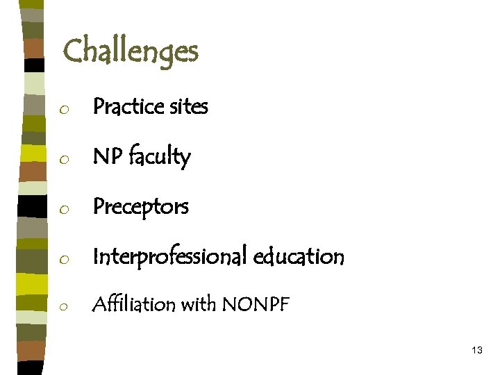 Challenges o Practice sites o NP faculty o Preceptors o Interprofessional education o Affiliation with NONPF 13
