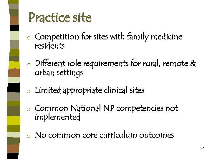 Practice site o Competition for sites with family medicine residents o Different role requirements for rural, remote & urban settings o Limited appropriate clinical sites o Common National NP competencies not implemented o No common core curriculum outcomes 14