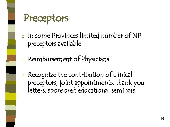 Preceptors o In some Provinces limited number of NP preceptors available o Reimbursement of Physicians o Recognize the contribution of clinical preceptors; joint appointments, thank you letters, sponsored educational seminars 16