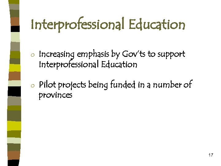 Interprofessional Education o Increasing emphasis by Gov’ts to support Interprofessional Education o Pilot projects being funded in a number of provinces 17