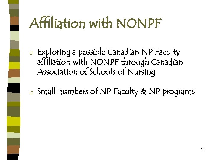 Affiliation with NONPF o Exploring a possible Canadian NP Faculty affiliation with NONPF through Canadian Association of Schools of Nursing o Small numbers of NP Faculty & NP programs 18