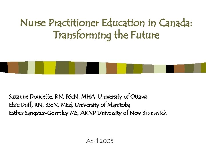 Nurse Practitioner Education in Canada: Transforming the Future Suzanne Doucette, RN, BSc. N, MHA University of Ottawa Elsie Duff, RN, BSc. N, MEd, University of Manitoba Esther Sangster-Gormley MS, ARNP University of New Brunswick April 2005