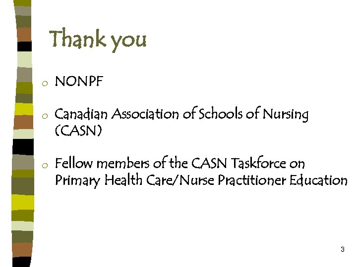Thank you o NONPF o Canadian Association of Schools of Nursing (CASN) o Fellow members of the CASN Taskforce on Primary Health Care/Nurse Practitioner Education 3