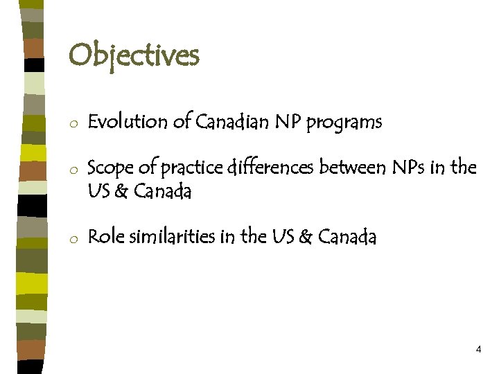 Objectives o Evolution of Canadian NP programs o Scope of practice differences between NPs in the US & Canada o Role similarities in the US & Canada 4
