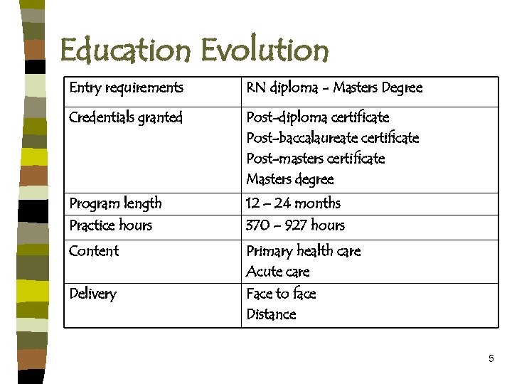 Education Evolution Entry requirements RN diploma - Masters Degree Credentials granted Post-diploma certificate Post-baccalaureate certificate Post-masters certificate Masters degree Program length 12 – 24 months Practice hours 370 – 927 hours Content Primary health care Acute care Delivery Face to face Distance 5