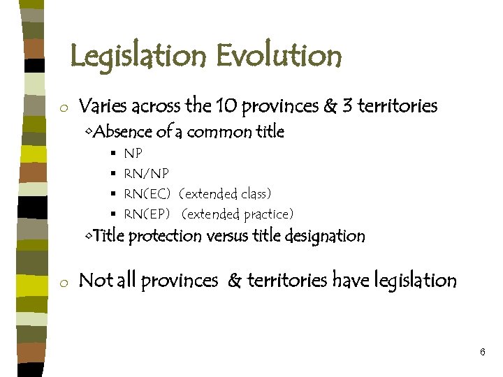 Legislation Evolution o Varies across the 10 provinces & 3 territories • Absence of a common title § § NP RN/NP RN(EC) (extended class) RN(EP) (extended practice) • Title protection versus title designation o Not all provinces & territories have legislation 6