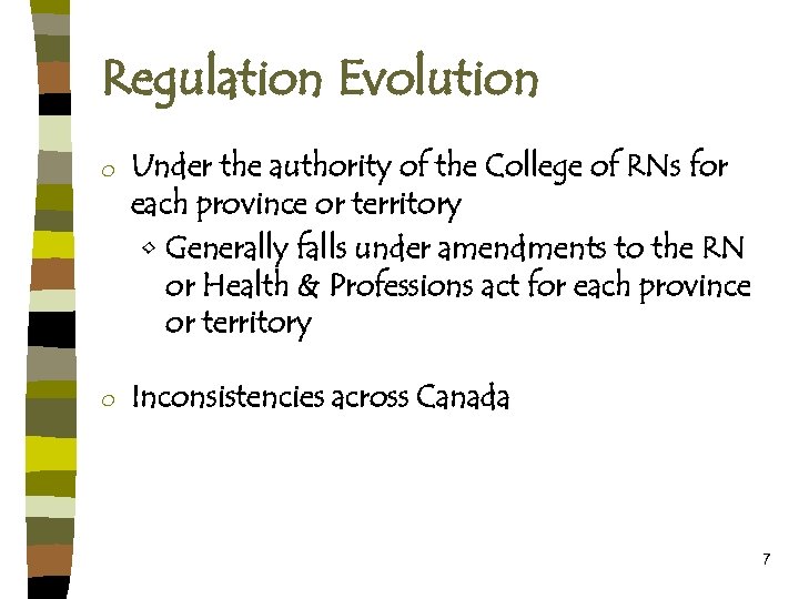 Regulation Evolution o Under the authority of the College of RNs for each province or territory • Generally falls under amendments to the RN or Health & Professions act for each province or territory o Inconsistencies across Canada 7