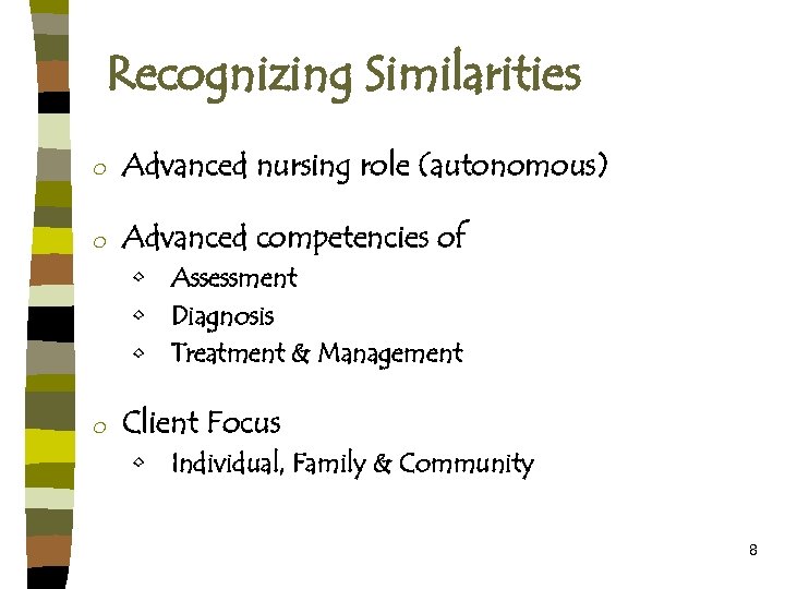 Recognizing Similarities o Advanced nursing role (autonomous) o Advanced competencies of • Assessment • Diagnosis • Treatment & Management o Client Focus • Individual, Family & Community 8
