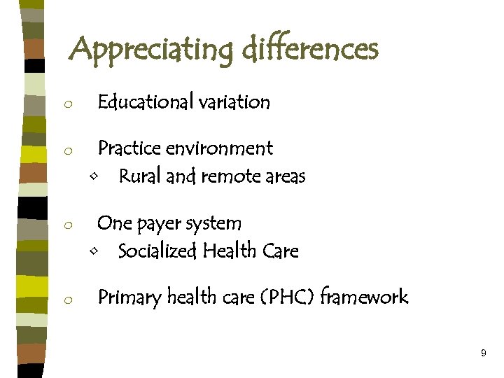 Appreciating differences o Educational variation o Practice environment • Rural and remote areas o One payer system • Socialized Health Care o Primary health care (PHC) framework 9