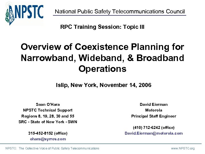 National Public Safety Telecommunications Council RPC Training Session: Topic III Overview of Coexistence Planning for Narrowband, Wideband, & Broadband Operations Islip, New York, November 14, 2006 Sean O’Hara NPSTC Technical Support Regions 8, 19, 28, 30 and 55 SRC - State of New York - SWN 315 -452 -8152 (office) ohara@syrres. com NPSTC: The Collective Voice of Public Safety Telecommunications David Eierman Motorola Principal Staff Engineer (410) 712 -6242 (office) David. Eierman@motorola. com www. NPSTC. org