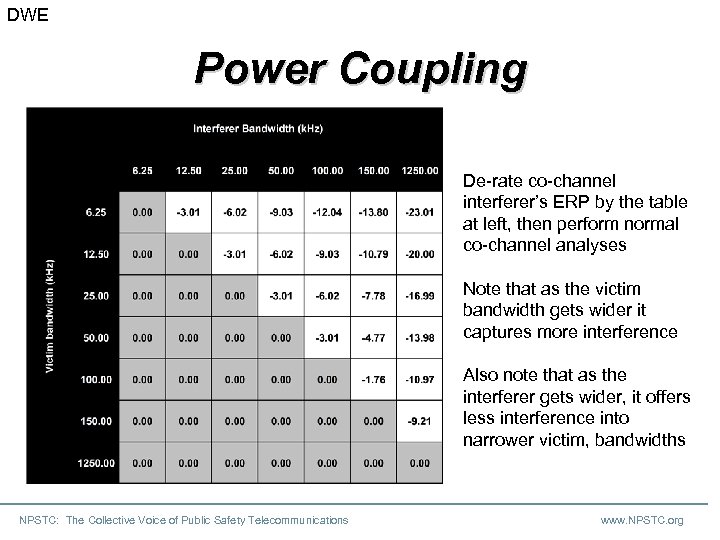 DWE Power Coupling De-rate co-channel interferer’s ERP by the table at left, then perform normal co-channel analyses Note that as the victim bandwidth gets wider it captures more interference Also note that as the interferer gets wider, it offers less interference into narrower victim, bandwidths NPSTC: The Collective Voice of Public Safety Telecommunications www. NPSTC. org