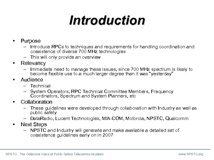 Introduction • Purpose – Introduce RPCs to techniques and requirements for handling coordination and coexistence of diverse 700 MHz technologies – This will only provide an overview • Relevancy – Immediate need to manage these issues, since 700 MHz spectrum is likely to become flexible use to a much larger degree than it was “yesterday” • Audience – Technical – System Operators, RPC Technical Committee Members, Frequency Coordinators, Spectrum and System Planners, etc • Collaboration – These guidelines were developed through collaboration with Industry as well as public safety – Data. Radio, Lucent Technologies, M/A-COM, Motorola, NPSTC, Qualcomm • Next Steps – NPSTC and Industry will generate and make available a detailed set of coexistence guidelines early on in 2007 NPSTC: The Collective Voice of Public Safety Telecommunications www. NPSTC. org