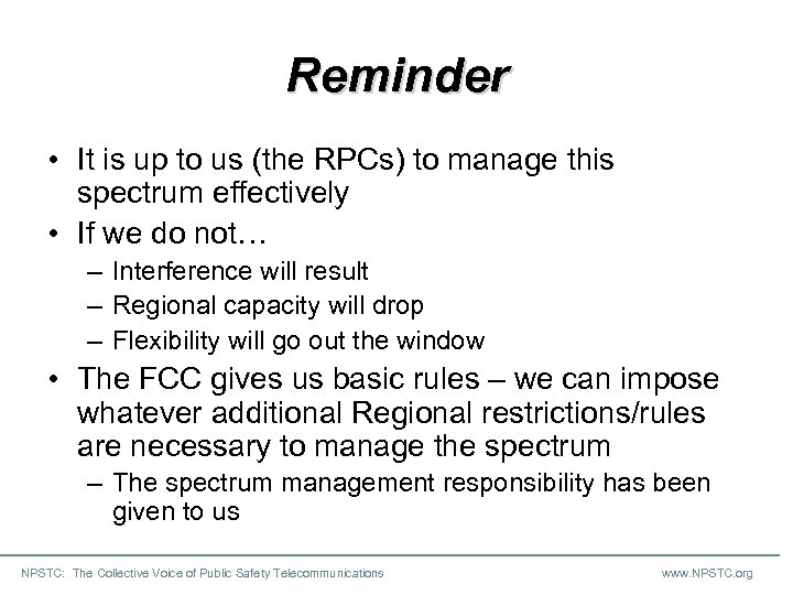 Reminder • It is up to us (the RPCs) to manage this spectrum effectively • If we do not… – Interference will result – Regional capacity will drop – Flexibility will go out the window • The FCC gives us basic rules – we can impose whatever additional Regional restrictions/rules are necessary to manage the spectrum – The spectrum management responsibility has been given to us NPSTC: The Collective Voice of Public Safety Telecommunications www. NPSTC. org