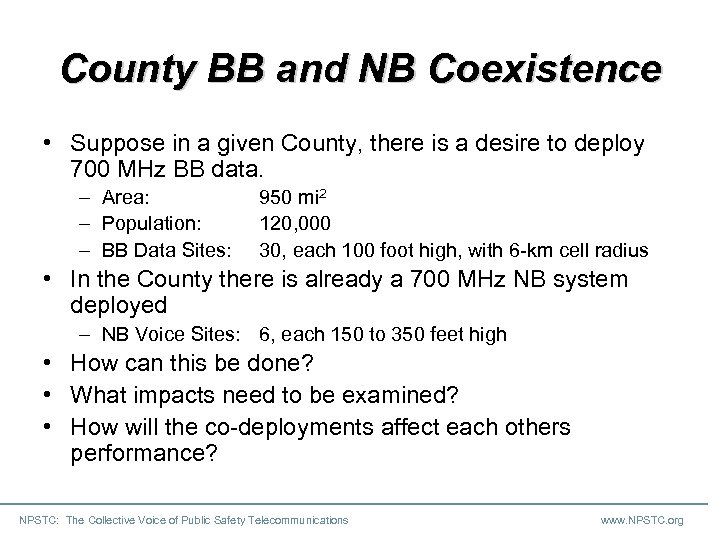 County BB and NB Coexistence • Suppose in a given County, there is a desire to deploy 700 MHz BB data. – Area: – Population: – BB Data Sites: 950 mi 2 120, 000 30, each 100 foot high, with 6 -km cell radius • In the County there is already a 700 MHz NB system deployed – NB Voice Sites: 6, each 150 to 350 feet high • How can this be done? • What impacts need to be examined? • How will the co-deployments affect each others performance? NPSTC: The Collective Voice of Public Safety Telecommunications www. NPSTC. org
