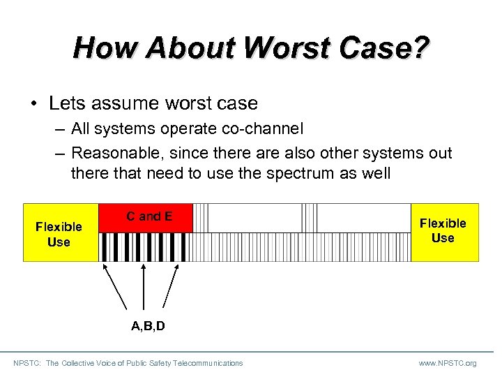 How About Worst Case? • Lets assume worst case – All systems operate co-channel – Reasonable, since there also other systems out there that need to use the spectrum as well Flexible Use C and E Flexible Use A, B, D NPSTC: The Collective Voice of Public Safety Telecommunications www. NPSTC. org