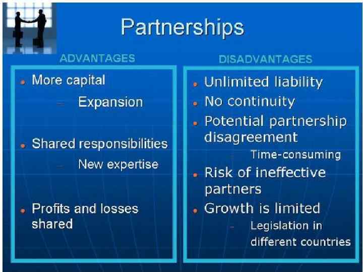 Partnership • Greater possible capital availability • Greater resources for decision making, support, creative activity • Unlimited liability in general partnerships • Divided authority-having to divide the authority for making decisions among the partners can delay the decision-making process and occasionally lead to disagreement