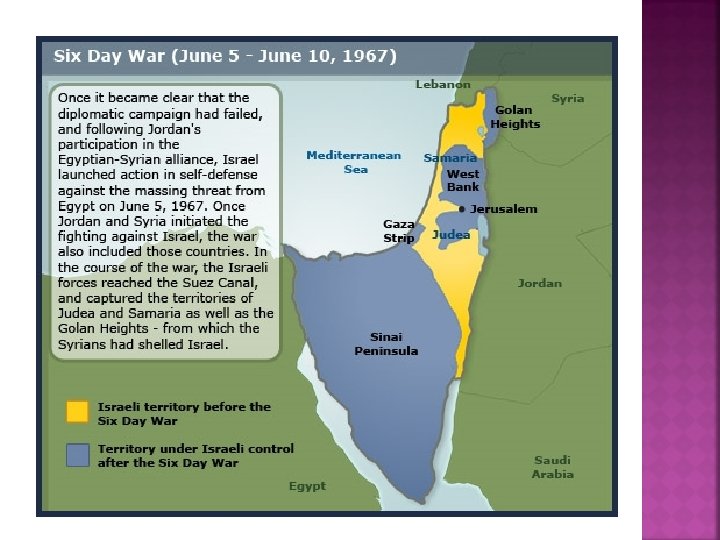 October 1973, Syrians and Egyptians surprise attacked Israel (Yom Kippur War) Recover lands lost in Six Day War in 1967 U. S supports Israel Arab nations of Organization of Petroleum Exporting Countries (OPEC) placed oil embargo on Israel supporters $2 bill in war materials Lifts in 1974, but raises oil prices 4 x Results Long lines at gas station Recession + inflation Buy fuel efficient Japanese car Hurt American car industry; loss of jobs 55 mph speed limit Alaska pipeline