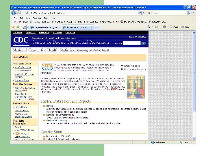 Website addresses l l Birth Data Web Page: http: //www. cdc. gov/nchs/births. htm l Linked Birth/Infant Death Web Page: http: //www. cdc. gov/nchs/linked. htm l 2003 Revisions of the U. S. Standard Certificates of Live Birth and Death and the Fetal Death Report Web Page: http: //www. cdc. gov/nchs/vital_certs_rev. htm l 31 National Center for Health Statistics Web Page: http: //www. cdc. gov/nchs/ U. S. Census Populations with Bridged Race Categories Web Page: http: //www. cdc. gov/nchs/about/major/dvs/popbridge. ht m