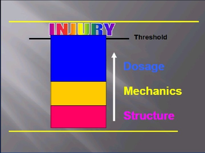 Physical stress level Effect of Physical Stress on Tissue Adaptation Death Injury Increased tolerance (hypertrophy) Maintenance Decreased tolerance (atrophy) Death Courtesy “Anatomy for Runners” by Jay Dicharry