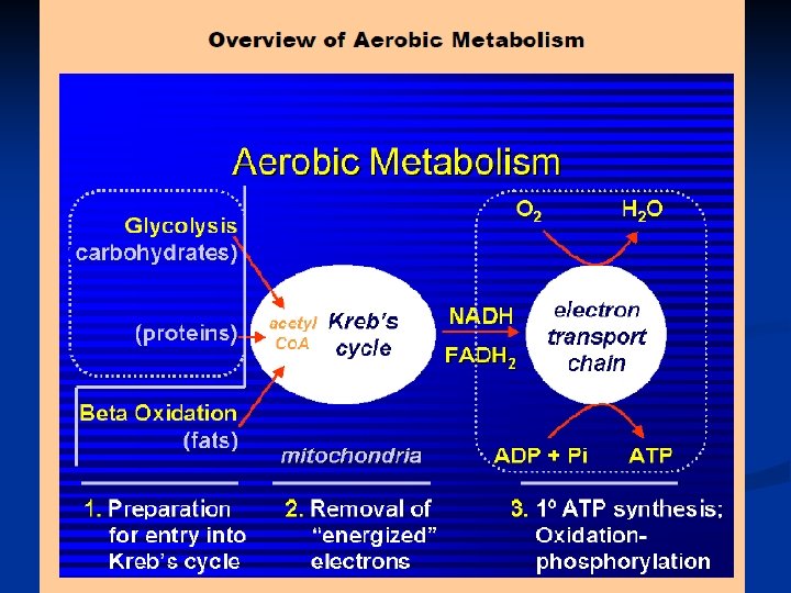 Energy Production Fatty Acids Glycogen Acetyl Co. A Glucose Citric Acid Fructose TCA Cycle +2 ATP Lacking O 2 Pyruvate (2) Lactate plus H+ +34 ATP With O 2 Acetyl Co. A [CO 2 + H 2 O]