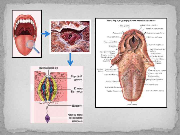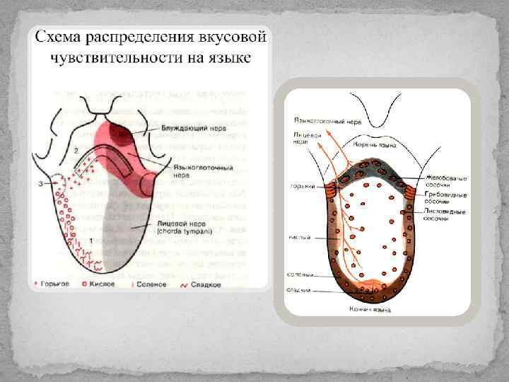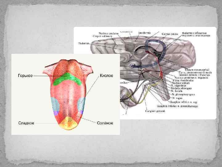 Надгортанник и гортань Задняя треть языка и глотка Передние 2/3 языка Блуждающий нерв Языкоглоточный нерв Лицевой нерв Узловой ганглий Каменистый ганглий Коленчатый ганглий Ядро одиночного пути Вентральный таламус Постцентральная извилина