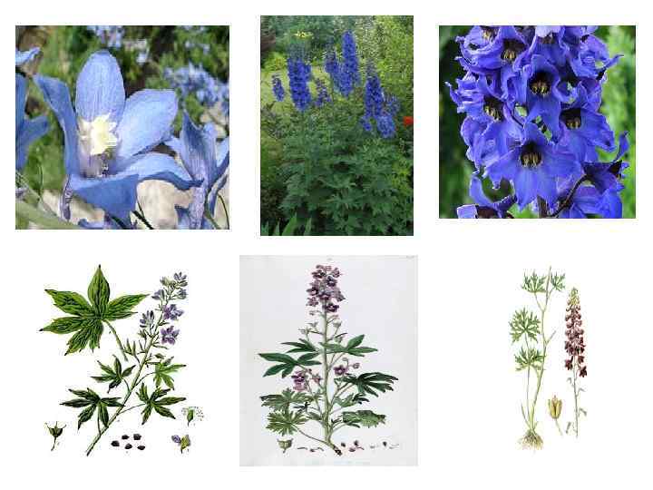 Корневая система бывает двух видов. Небольшой клубне-видно-вздутый конический корень. При другом типе корневой системы клубней не образуется, а развиваются многочисленные тонкие шнуровидные корни. Соцветия — верхушечная кисть из крупных цветков. Цветки неправильные зигоморфные: чашечка пятилистная, окрашенная (жёлтая, синяя, сиреневая или белая), венчиковидная; верхний листочек её шлемовидной формы; под этим шлемом находится редуцированный венчик, превращённый в 2 нектарника; тычинок много, завязь верхняя порца ет. ш н Цветут во второй половине лета. Формула цветка: Плоды сухие, много-семенные листовки. .