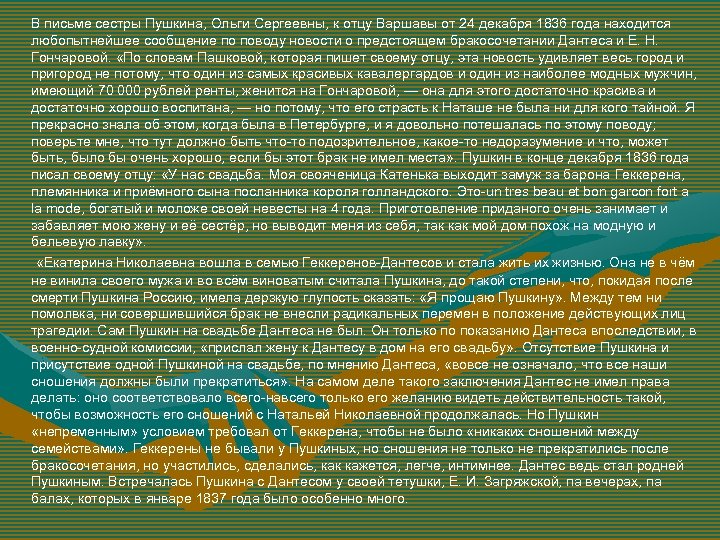 ПЛАН. 1. Введение. 2. Наталья Гончарова и Пушкин. 3. Дантес. 4. Причины дуэли. 5. Вывод. Исследовательская работа. ВВЕДЕНИЕ. Последний период жизни Пушкина наиболее обилен новыми документами. Безвременная, трагическая смерть гения всегда привлекает внимание, особенно если эта смерть была насильственной или предполагает «загадочные» обстоятельства. Вспомним, как обширна литература и сколько существует гипотез вокруг смерти Моцарта. А там, где возникает повышенный интерес, там больше целенаправленных поисков, там скорее возможны новые находки и новые гипотезы. Чем интересна эта тема сегодня, когда мы читали воспоминания современников поэта, а в последние годы — новые публикации, статьи и даже новую книгу о дуэли Пушкина, следили за перипетиями их дней Пушкина на сцене? В истории дуэли было много неясного, загадочного не только для современников, но и для нас, оснащенных документами, имеющих возможность сравнивать и сопоставлять факты неизвестные даже близким друзьям Пушкина, в дуэли остаются все же «темные» места, которые различны толкованиями: был ли в анонимном пасквиле намек на Пушкина, как на возможного претендента на место «величавого рогоносца» , кто сочинил пасквиль и кто его писал, когда пасквиль попал в 111 отделение, что заставило Наталью Николаевну переступить порог квартиры Идалии Полетики, и когда это было, когда Екатерина Гончарова впервые узнала, что ей собираются сделать предложение, какого числа отправил Пушкин «ругательное» письмо «старому» Геккерну, и что послужило непосредственным поводом к дуэли — казарменные каламбуры Дантеса или новые анонимные письма, о которых говорится в военно судном деле 28, или, может быть, разгадку следует искать в конспективных заметках Жуковского, который уже после смерти Пушкина записал: «В понедельник приезд Геккерна и ссора на лестнице» . В этот понедельник, 25 января, Пушкин написал Геккерну оскорбительное письмо, делавшее дуэль неизбежной.