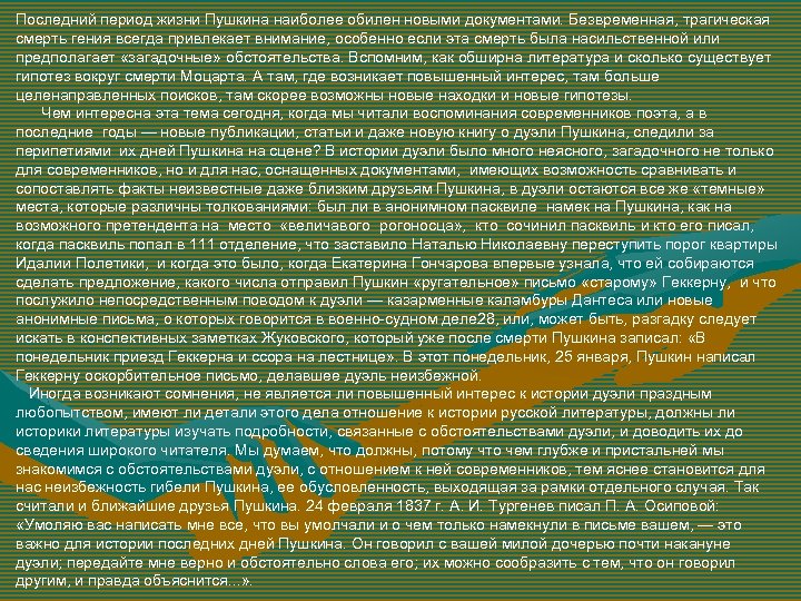 Иногда возникают сомнения, не является ли повышенный интерес к истории дуэли праздным любопытством, имеют ли детали этого дела отношение к истории русской литературы, должны ли историки литературы изучать подробности, связанные с обстоятельствами дуэли, и доводить их до сведения широкого читателя. Мы думаем, что должны, потому что чем глубже и пристальней мы знакомимся с обстоятельствами дуэли, с отношением к ней современников, тем яснее становится для нас неизбежность гибели Пушкина, ее обусловленность, выходящая за рамки отдельного случая. Так считали и ближайшие друзья Пушкина. 24 февраля 1837 г. А. И. Тургенев писал П. А. Осиповой: «Умоляю вас написать мне все, что вы умолчали и о чем только намекнули в письме вашем, — это важно для истории последних дней Пушкина. Он говорил с вашей милой дочерью почти накануне дуэли; передайте мне верно и обстоятельно слова его; их можно сообразить с тем, что он говорил другим, и правда объяснится. . . » . ЦЕЛЬЮ МОЕЙ НАУЧНОЙ РАБОТЫ было с помощью различного рода исследований доказать истинную причину дуэли и смерти Александра Сергеевича Пушкина, опираясь на исторические документы, и ещё мне хотелось взглянуть на данную проблему глазами современников, услышать мнение не только педагогов, но и учащихся. В мою задачу не входит подробное изображение семейной жизни Пушкина; здесь важно отметить лишь некоторые моменты и подробности семейной истории Пушкина, не в достаточной, быть может, мере привлекавшие внимание исследователей. Для нас же они важны с точки зрения освещения семейного положения Пушкина в конце 1836 г. Обстоятельствами семейными объясняется многое в душевном состоянии Пушкина в последние месяцы его жизни.