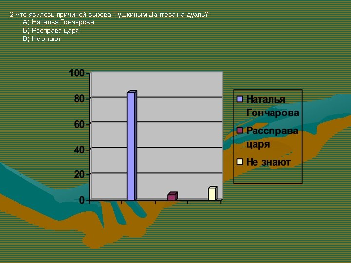 2. Что явилось причиной вызова Пушкиным Дантеса на дуэль? А) Наталья Гончарова Б) Расправа царя В) Не знают