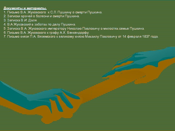 Документы и материалы. 1. Письмо В. А. Жуковского к С. Л. Пушкину о смерти Пушкина. 2. Записки врачей о болезни и смерти Пушкина. 3. Записка В. И. Даля. 4. В. А Жуковский в заботах по делу Пушкина. 5. Записка В. А. Жуковского императору Николаю Павловичу о милостях семье Пушкина. 6. Письмо В. А. Жуковского к графу А. Х. Бенкендорфу. 7. Письмо князя П. А. Вяземского к великому князю Михаилу Павловичу от 14 февраля 1837 года.