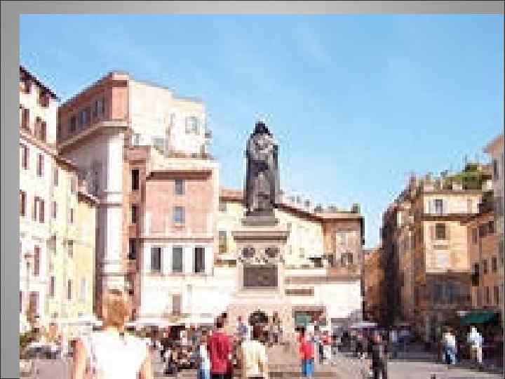 ДЖОРДАНО БРУНО (1548 -1600) Джордано Бруно - великий итальянский ученый, философ, поэт, пламенный сторонник и пропагандист учения Коперника. С 14 лет обучался в доминиканском монастыре и стал монахом, сменив подлинное имя Филиппо на Джордано. Глубокие знания получил путем самообразования в богатой монастырской библиотеке. За смелые выступления против догматов церкви и поддержку учения Коперника Бруно вынужден был покинуть монастырь. Преследуемый церковью он долгие годы скитался по многим городам и странам Европы. Везде он читал лекции, выступал на публичных богословских диспутах. Так, в Оксфорде в 1583 г. на знаменитом диспуте о вращении Земли, бесконечности Вселенной и бесчисленности обитаемых миров в ней он, по отзывам современников, "раз пятнадцать заткнул рот бедняге доктору" - своему оппоненту.