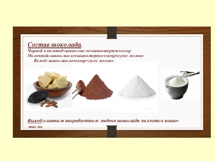 Вещество Витамин А Комплекс витаминов группы B Полезные свойства для организма человека благотворно влияет на зрение, рост костей, здоровье кожи, а также способствует поддержанию иммунитета. нервная система, обмен аминокислот, углеводный обмен, развитие мышц, правильная работа ЖКТ, предотвращение болезней сердца, а также рост и восстановление клеток организма, стимуляция синтеза гормонов надпочечников, работа печени и поджелудочной железы. Витамин PP антиоксидант, борется с воспалениями, стимулирует работу сердца, участвует в процессах усвоения жиров и аминокислот, а также играет важную роль в образовании эритроцитов, защищает от тромбоза, гипертонии и диабета, стимулирует выработку желудочного сока. Витамин PP также помогает бороться с тяжелыми мигренями (головными болями). Витамин D отвечает за развитие и рост костей, предотвращая рахит, артрит, остеопороз, снижает риск развития сахарного диабета и атеросклероза, а также поддерживает иммунную систему, предотвращая развитие раковых клеток. Витамин Е сильный антиоксидант, в большом количестве содержится в горьком шоколаде. Облегчает протекание сахарного диабета, благотворно влияет на иммунную систему, предотвращает анемию, способствует правильной свертываемости крови, укрепляет стенки капилляров. Кроме того, витамин Е снимает судороги ног, повышает упругость кожи, замедляет процессы старения. Витамин F крепкие ногти, увлажненная кожа, здоровые волосы. Препятствует образованию тромбов, разжижая кровь. Кальций для крепких костей. Магний повышает устойчивость к стрессам. Калий Фосфор стимулятор нервных импульсов, помощник в нервно-мышечной деятельности. Регулирует уровень кислорода в мозге, отвечает за развитие и рост мышечной системы. необходим для хорошей работы мозга. Фтор вопреки всеобщему убеждению, что шоколад вызывает кариес, фтор в качественном шоколаде способствует укреплению зубов. Танины это вещества, без которых невозможен вывод радионуклидов из организма. Предотвращает образование зубного налета, обладая антибактериальными свойствами. Танин также укрепляет сосуды и улучшает пищеварение. Железо защита от анемии – понижения гемоглобина (красных телец) в крови. Цинк укрепление иммунитета, защита клеток кожи от морщин и других проблем. Медь помогает абсорбировать железо, способствует правильному развитию кровеносных сосудов, соединительных тканей, и обеспечивает здоровье кожи.