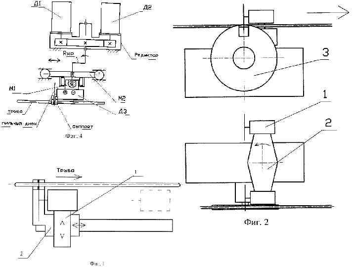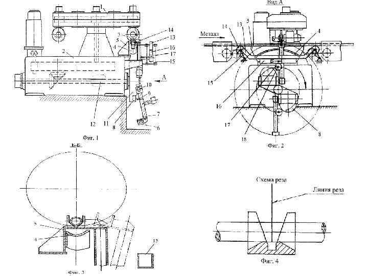 Летучая пила для резки труб • • Реферат: Изобретение относится к машиностроению и может быть использовано при производстве горячекатаных труб. Пила содержит установленный на корпусе планетарный редуктор, на периферийных валах которого размещены электродвигатели с режущими дисками. Механизм подачи трубы на рез выполнен в виде связанного с электромагнитом рычага с вилкой, а также пружины возврата. Пила выполнена с механизмом подъема трубы с балкой, на которой размещены ролики, при этом балка шарнирно установлена на двух наклонных рычагах, нижние концы которых связаны шарнирами с корпусом летучей пилы, а на средней части балки размещен копир, взаимодействующий с роликом, установленным на оси, закрепленной на рычаге механизма подачи. Обеспечивается получение прямых концов труб при резке, снижаются потери металла и повышается качество труб в части уменьшения кривизны. 4 ил. Изобретение относится к области металлургического производства, а именно к производству горячекатаных труб. Техническим результатом предлагаемой пилы является то, что в процессе реза концы труб не изгибаются и остаются прямыми при диаметре, например, 128 мм. Технический результат достигается тем, что механизм подъема трубы снабжен балкой, на которой размещены ролики, при этом балка шарнирно установлена на двух наклонных рычагах, нижние концы которых связаны шарнирами с корпусом летучей пилы, а на средней части балки размещен копир, взаимодействующий с роликом, установленным на оси, закрепленной на рычаге механизма подъема трубы на рез. На фиг. 1 схематически показана предлагаемая летучая пила. На фиг. 2 показан вид по стрелке А на фиг. 1. На фиг. З показан разрез Б-Б на фиг. 2. На фиг. 4 показана схема реза проката, расположенного в подающей вилке.