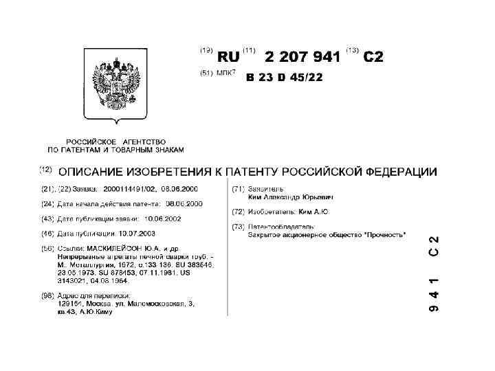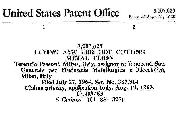 Американский патент • • • FLYING SAW FOR HOT CUTTING METAL TUBES Изобретение относится к области обработки металлов давлением, предназначено для разрезания движущегося проката на мерные длины и может быть использовано в непрерывных трубоэлектросварочных и профилегибочных агрегатах. Летучая пила снабжена режущим диском, который расположен на передвижной раме, выполняющей колебания или ротационное движение. Пила догоняет трубу, сравнивает скорость и обхватывая зажимает ее, распиливая на ходу.