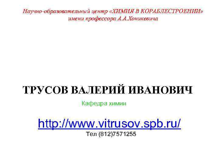 Научно-образовательный центр «ХИМИЯ В КОРАБЛЕСТРОЕНИИ» имени профессора А. А. Хоникевича ТРУСОВ ВАЛЕРИЙ ИВАНОВИЧ Кафедра химии http: //www. vitrusov. spb. ru/ Тел (812)7571255