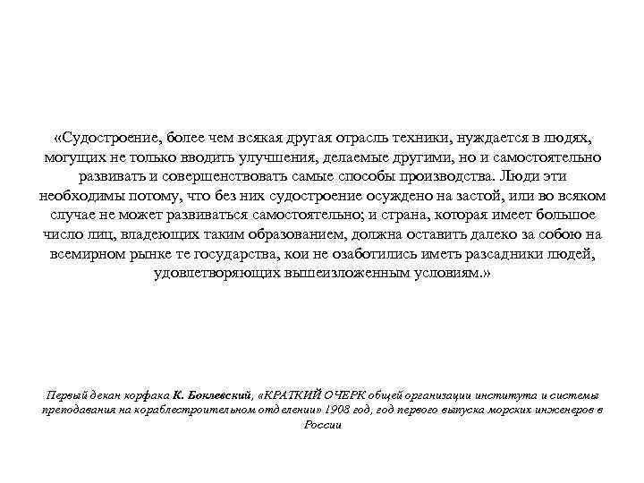 «Судостроение, более чем всякая другая отрасль техники, нуждается в людях, могущих не только вводить улучшения, делаемые другими, но и самостоятельно развивать и совершенствовать самые способы производства. Люди эти необходимы потому, что без них судостроение осуждено на застой, или во всяком случае не может развиваться самостоятельно; и страна, которая имеет большое число лиц, владеющих таким образованием, должна оставить далеко за собою на всемирном рынке те государства, кои не озаботились иметь разсадники людей, удовлетворяющих вышеизложенным условиям. » Первый декан корфака К. Боклевский, «КРАТКИЙ ОЧЕРК общей организации института и системы преподавания на кораблестроительном отделении» 1908 год, год первого выпуска морских инженеров в России