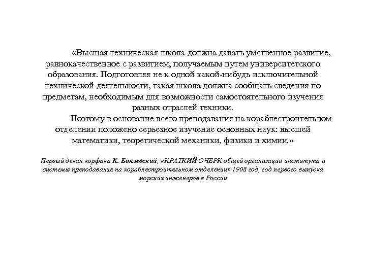 «Высшая техническая школа должна давать умственное развитие, равнокачественное с развитием, получаемым путем университетского образования. Подготовляя не к одной какой-нибудь исключительной технической деятельности, такая школа должна сообщать сведения по предметам, необходимым для возможности самостоятельного изучения разных отраслей техники. Поэтому в основание всего преподавания на кораблестроительном отделении положено серьезное изучение основных наук: высшей математики, теоретической механики, физики и химии. » Первый декан корфака К. Боклевский, «КРАТКИЙ ОЧЕРК общей организации института и системы преподавания на кораблестроительном отделении» 1908 год, год первого выпуска морских инженеров в России