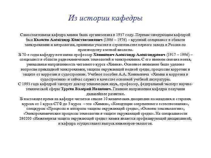 Из истории кафедры Самостоятельная кафедра химии была организована в 1937 году. Первым заведующим кафедрой был Колосов Александр Константинович (1886 – 1976) – крупный специалист в области электрохимии и метрологии, принимал участие в строительстве первого завода в России по производству азотной кислоты. В 70 -е годы кафедру возглавил профессор Хоникевич Александрович (1917 – 1996) – специалист в области радиохимических технологий и электрохимии. С его именем связана новая, уникальная направленность читаемого курса «Химия» . Основное внимание было уделено вопросам прикладной электрохимии, защиты окружающей водной среды, процессам коррозии и защите от коррозии в судостроении. Учебное пособие А. А. Хоникевича «Химия и коррозия в судостроении» и сейчас служит в качестве основной учебной литературы. С 1993 года кафедрой заведует доктор технических наук, профессор, федеральный эксперт научнотехнической сферы Трусов Валерий Иванович. Главные направления кафедры получили дальнейшее развитие. В настоящее время на кафедре читается свыше 10 химических дисциплин на младших и старших курсах от 1 курса СТФ до 5 курса – это «Химия» , «Концепции современного естествознания» , спецкурсы «Процессы и аппараты защиты окружающей среды» , «Основы токсикологии» , «Электрохимические процессы технологии в защите окружающей среды» . На специальности 280200 «Инженерная защита окружающей среды» химия является профилирующей дисциплиной, и кафедра осуществляет выпуск инженеров-экологов.