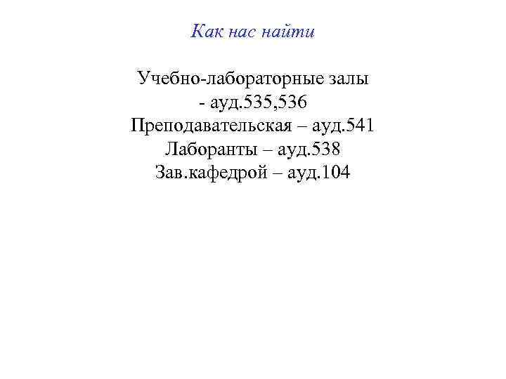 Как нас найти Учебно-лабораторные залы - ауд. 535, 536 Преподавательская – ауд. 541 Лаборанты – ауд. 538 Зав. кафедрой – ауд. 104