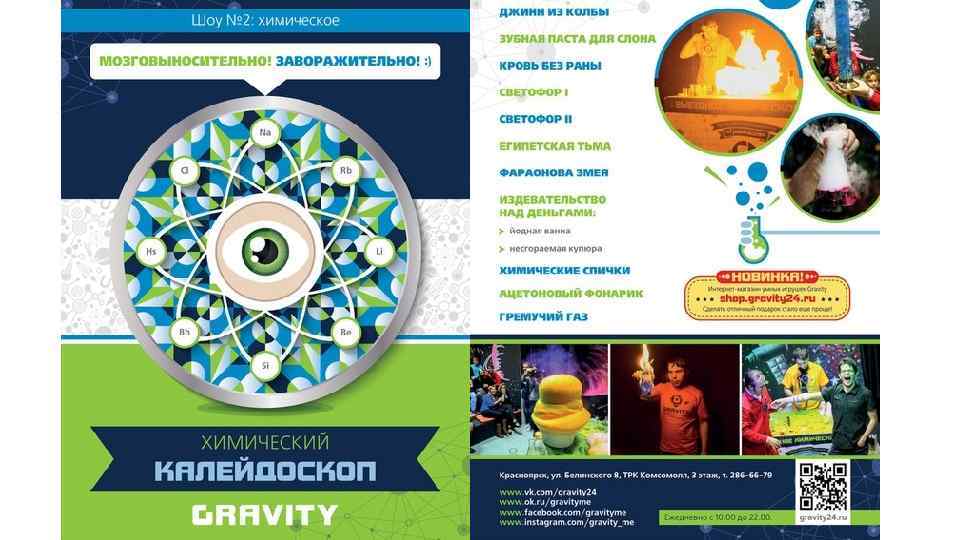 Научные шоу в «Гравитации» В научно-развлекательном центре «Гравитация» у детей и взрослых есть возможность посмотреть на настоящую «научную кухню» : интересные занимательные эксперименты! Все шоу интерактивны и зрители могут поучаствовать в каждом из них. В «Гравитации» проходят три шоу: - физическое шоу «Эксперименты котика Азотика» - химическое шоу «Химический калейдоскоп» - электросветовое шоу «Короткое замыкание» Телефон: 286 -66 -79