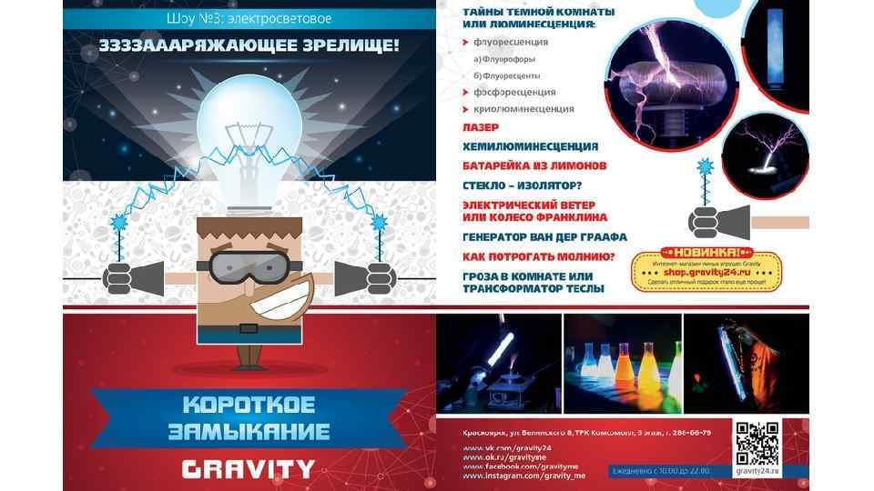 О центре «Гравитация» или «GRAVITY» - проект альтернативного интеллектуального досуга жителей Красноярского края, успешно функционирующий уже год. Посещение «Гравитации» будет интересно и детям и взрослым, ведь центр дает возможность сократить расстояние в понимании точных наук от теории к практике, вживую увидеть все то, о чем говорится на уроках физики и химии, понять, что наука может быть веселой и интересной! Телефон: 286 -66 -79