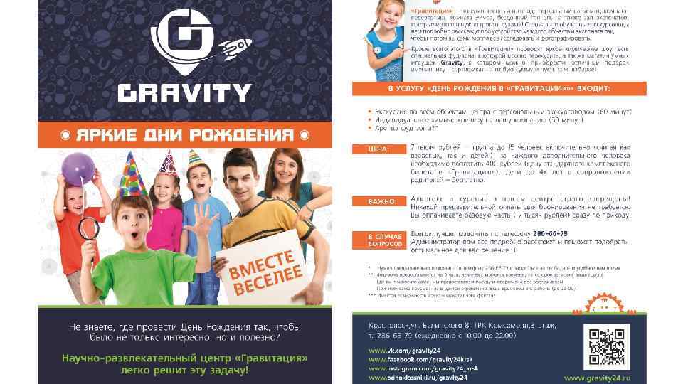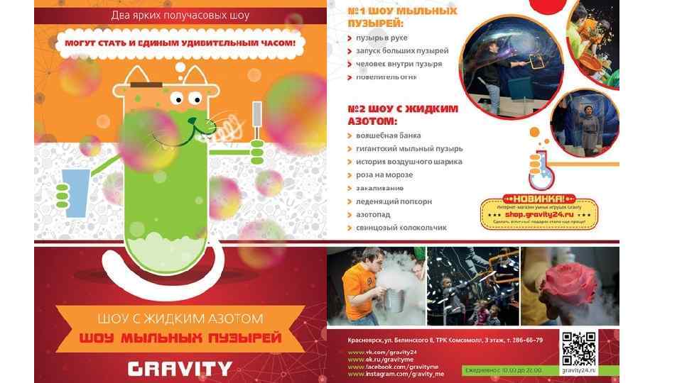 Контакты Адрес: г. Красноярск, ул. Белинского 8, (ТРК «Комсо. МОЛЛ» ), 3 этаж, «Gravity» Время работы: ежедневно с 10: 00 до 22: 00 Сайт: gravity 24. ru Группа в VK: vk. com/gravity 24 Телефон для справок: 286 -66 -79