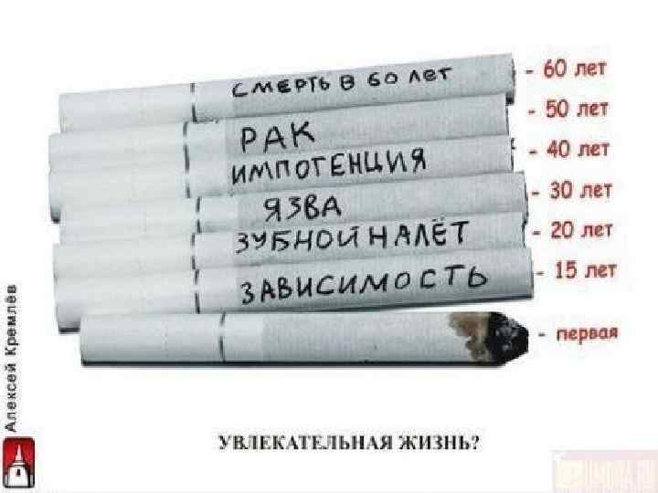 Цена сигареты ¢ Каждые 10 секунд от последствий употребления табака на планете гибнет один человек (без учета так называемых «пассивных курильщиков). ( Таков результат исследований Всемирной организации здравоохранения. )